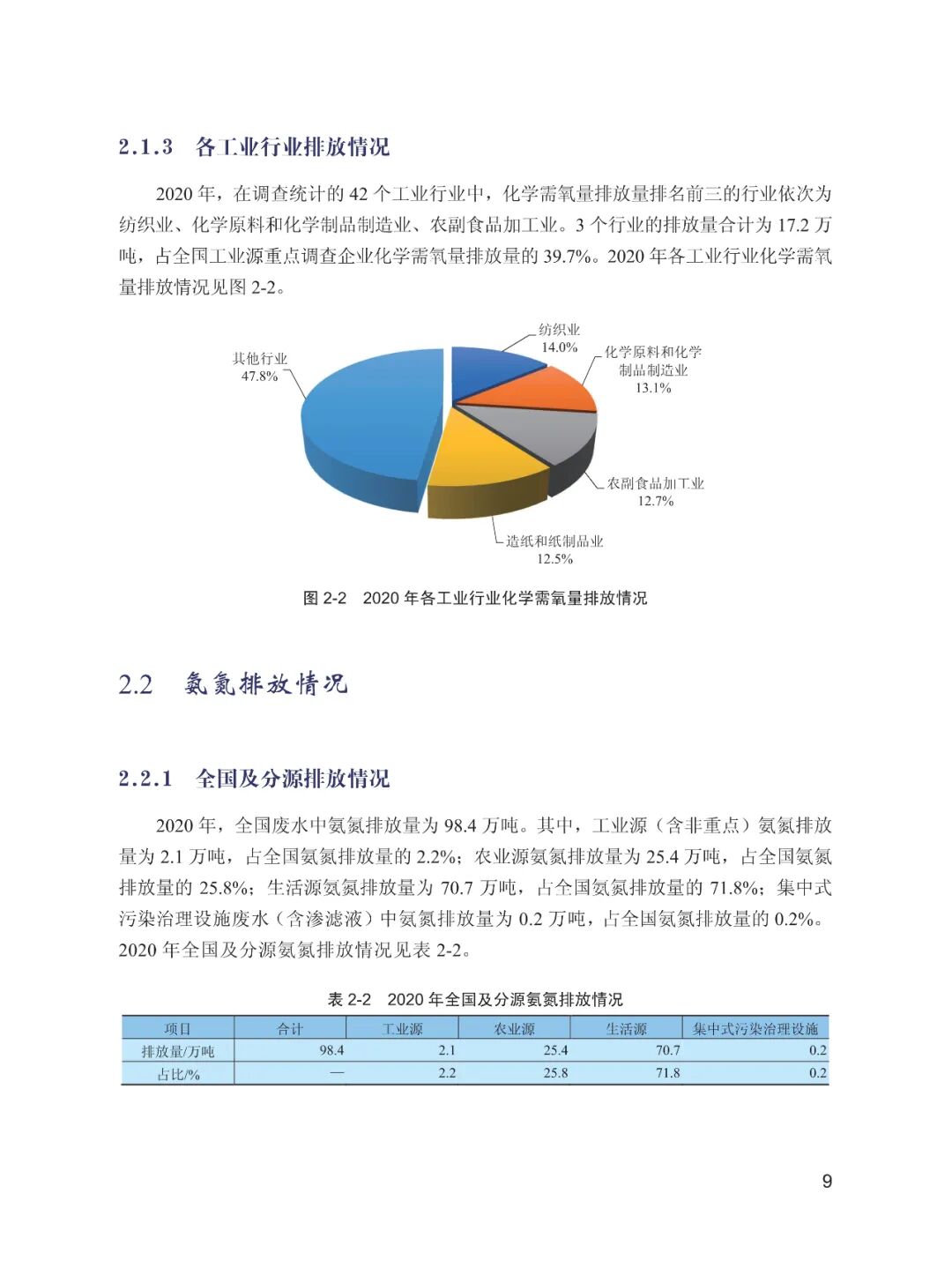 氨氮排放量为98.4万吨,其中,工业源废水中氨氮排放量为 2.1 万吨,农业源氨氮排放量为 25.4 万吨,生活源污水中氨氮排放量为 70.7 万吨,集中式污染治理设施废水(含渗滤液)中氨氮排放量为 0.2 万吨。